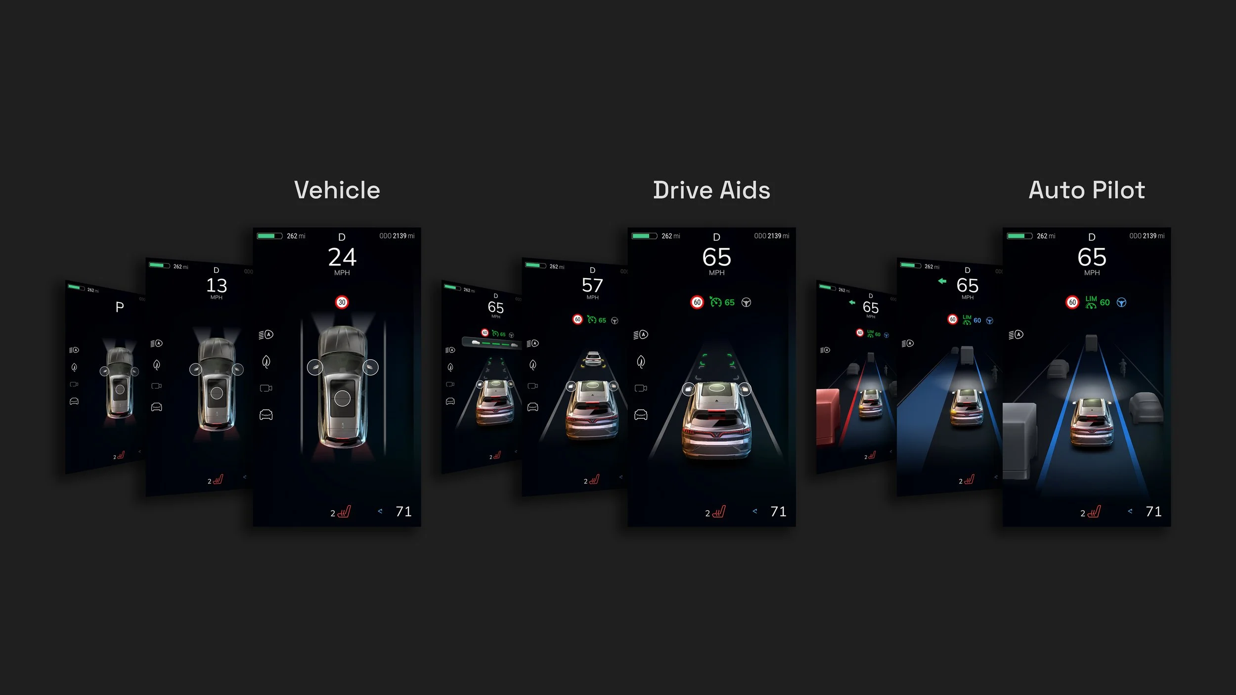 The left side of the screen is dedicated to vehicle information like charge level, speed, odometer, info/warning lights, drive aids & auto pilot visualizations.